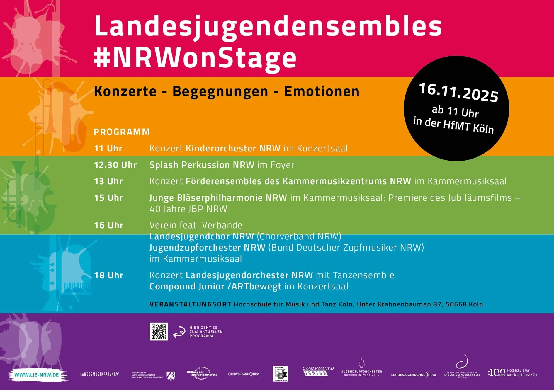 Wir laden herzlich ein, unsere Landesjugendensembles im Rahmen des 100-Jährigen Jubiläums der Hochschule für Musik und Tanz Köln am 16. November in der HfMT Köln zu besuchen. Es gibt dort die Gelegenheit, das Kinderorchester NRW, Splash Perkussion NRW, Förderensembles des Kammermusikzentrums NRW und das Landesjugendorchester NRW mit dem Tanzensemble Compound Junior/ ARTbewegt sowie weitere Gäste der Landesjugendensembles live zu erleben. Zudem präsentiert die Junge Bläserphilharmonie NRW erstmals ihren Jubiläumsfilm.