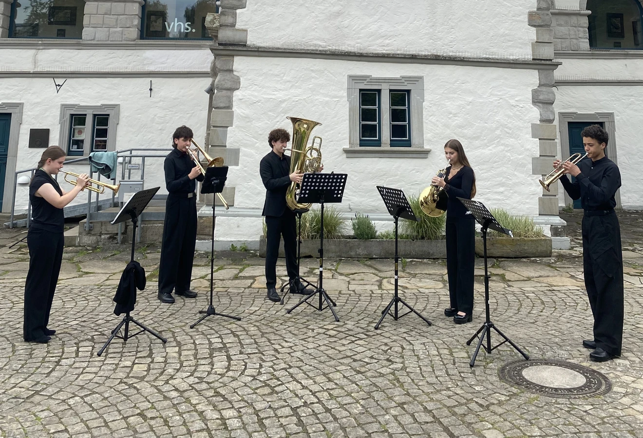 Das Wetter war perfekt für ein Konzert im Garten des Wasserschloss Haus Rodenberg in Dortmund. Aber nicht nur die Sonne, sondern vor allem die tolle Leistung der fünf Blechbläser führte zu guter Laune bei den Zuschauer:innen an diesem Sonntagmittag. Angereist waren u.a. die Mitarbeiter des Konzerthaus Dortmund, die diesen Tag für einen Ausflug mit dem Fahrrad nutzten. Wir bedanken uns bei Jan Böhme für die sehr gute Vorbereitung und bei Carola Beukenbusch für die Betreuung vor Ort!